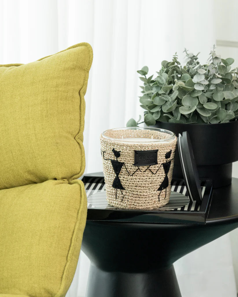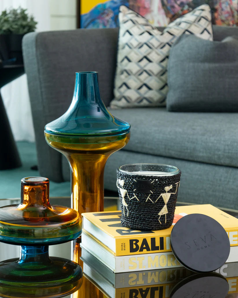 SEVA's Avante Garde Candle, a breathtaking blend of modern design and Warli tribal artistry, brings the essence of the Indian forest into your home. This contemporary glass jar, adorned with a hand-woven sleeve crafted from natural raffia, offers more than just fragrance—it’s a woven masterpiece. Envelop your space with the lush aromas of mandarins, orange flowers, vanilla, jasmine, sandalwood, and amber, creating a harmonious blend of tradition and luxury.