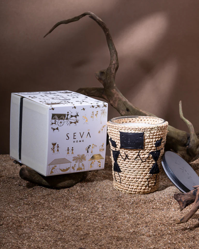 SEVA's Avante Garde Candle, a fusion of modern design and traditional artistry, brings the heart of the Indian forest to your home. The contemporary glass jar is wrapped in a hand-woven Warli art sleeve made from natural raffia, creating a stunning visual experience. With lush fragrances of mandarins, orange flowers, vanilla, jasmine, sandalwood, and amber, it fills your space with the essence of nature and warmth.