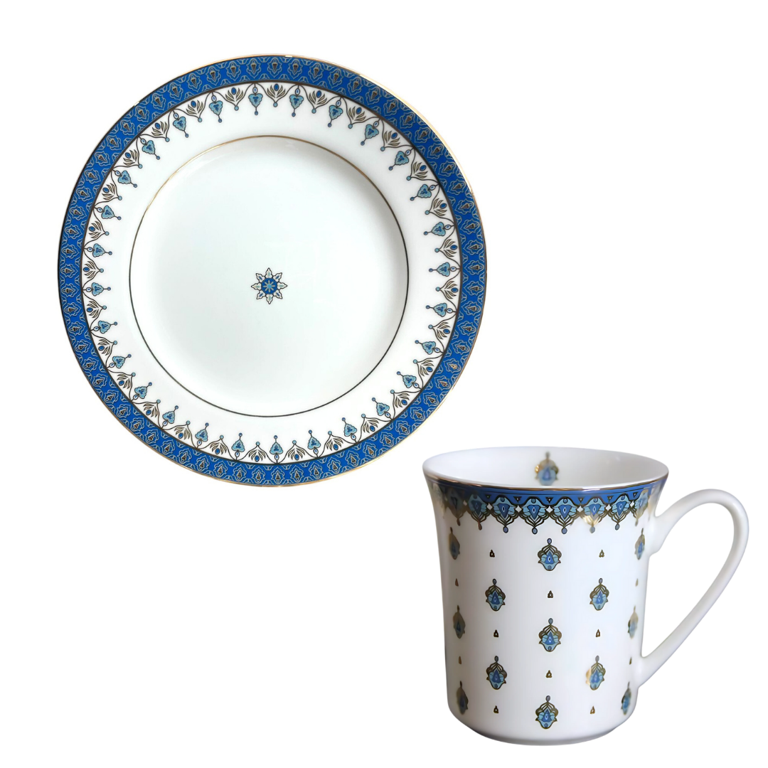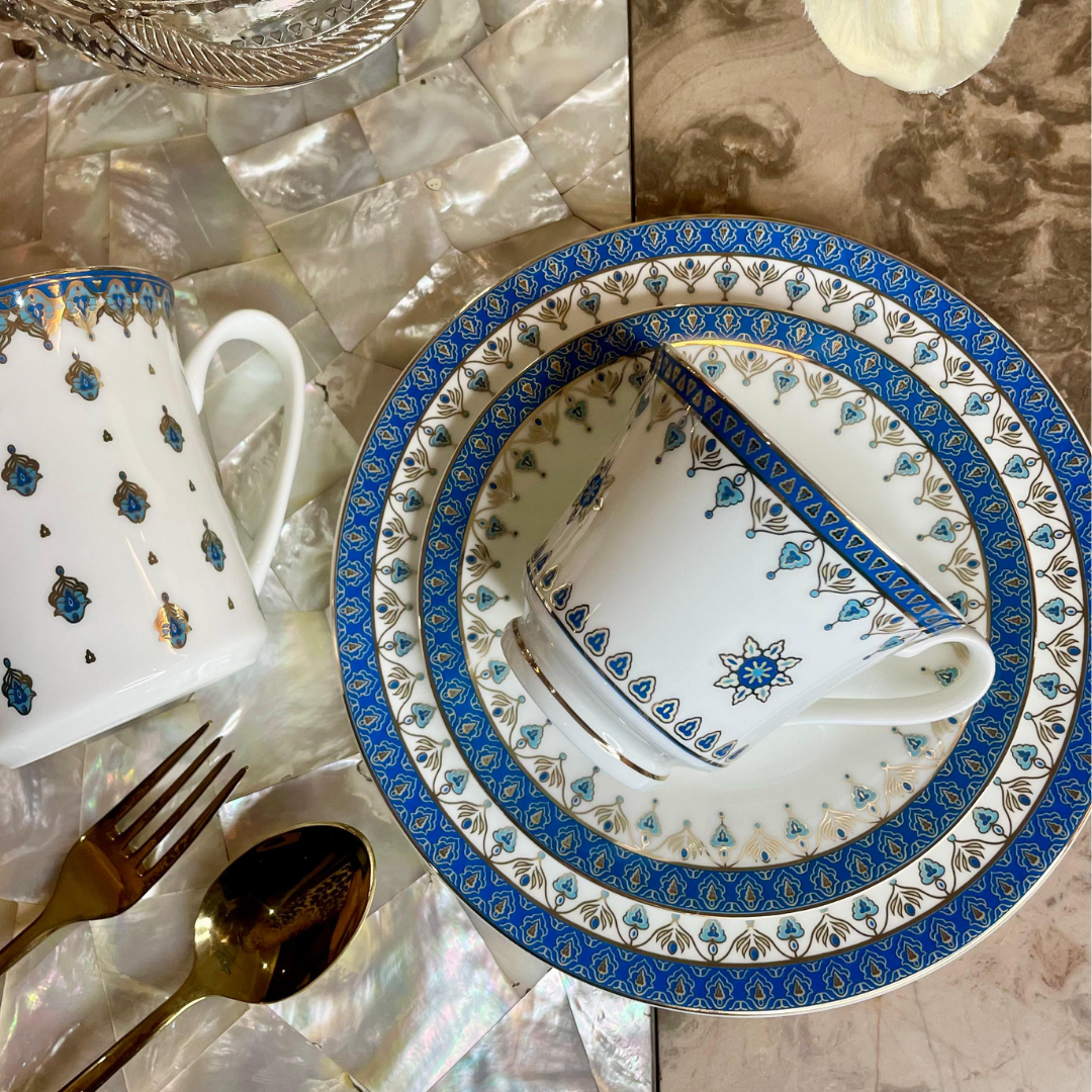 This design celebrates the rich tradition of artisan craftsmanship, inspired by the intricate patterns of ancient European tapestries. The bold blue motifs, elegantly interwoven with delicate details, echo the timeless artistry of historic textiles, weaving stories of culture and heritage through generations. This collection infuses modern dining with a touch of artistic elegance.