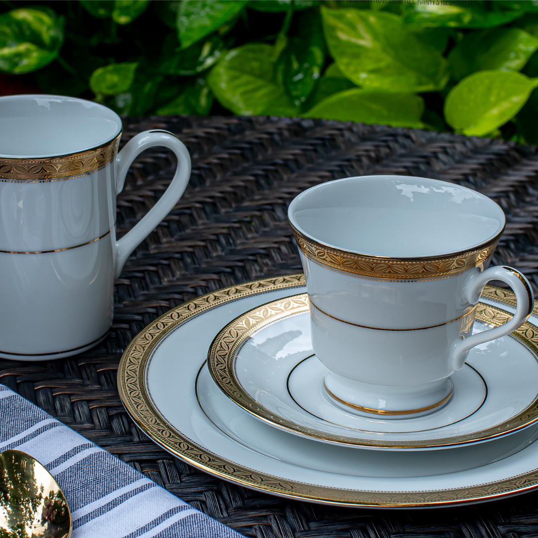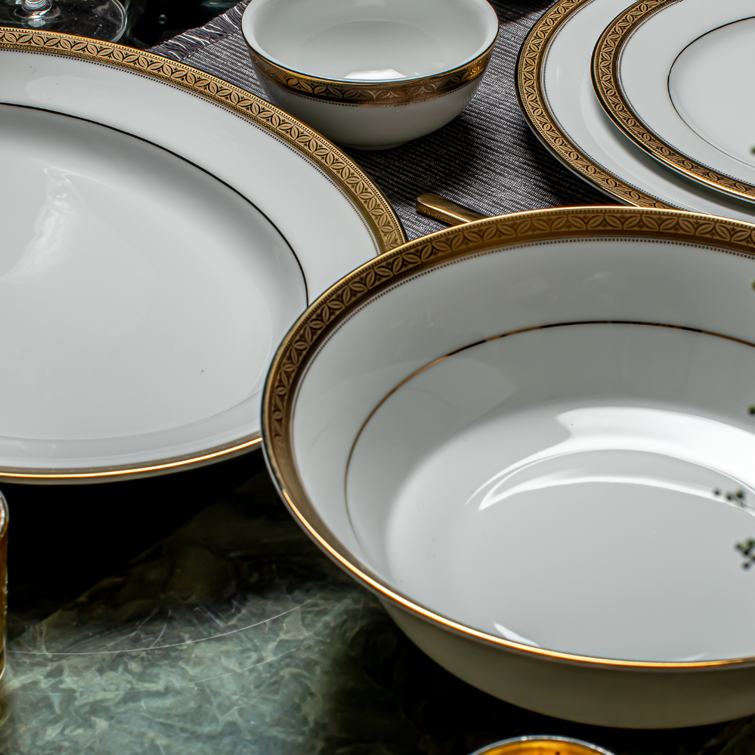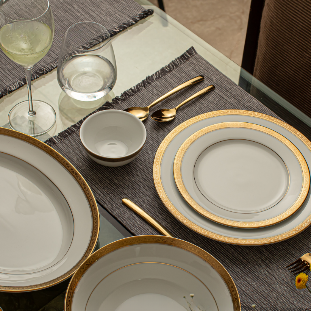 The timeless elegance of the gold-rimmed dinnerware is inspired by royal dining traditions. Drawing from classic European styles, this collection embodies refinement and heritage, making it perfect for formal occasions, elevating everyday dining experience.