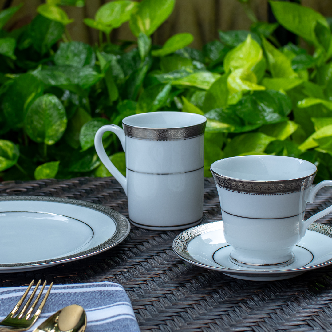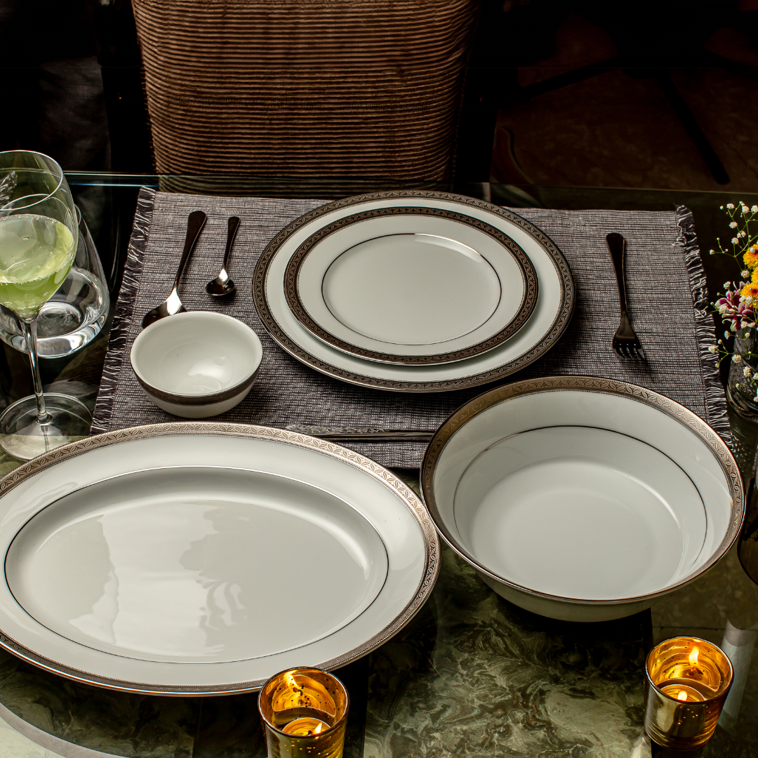 The silver detailing reflects the refined craftsmanship seen in the English historic estates, while the clean white base brings the serenity of Essex’s open landscapes to your table. This collection is perfect for those who appreciate countryside living combined with modern-day dining.