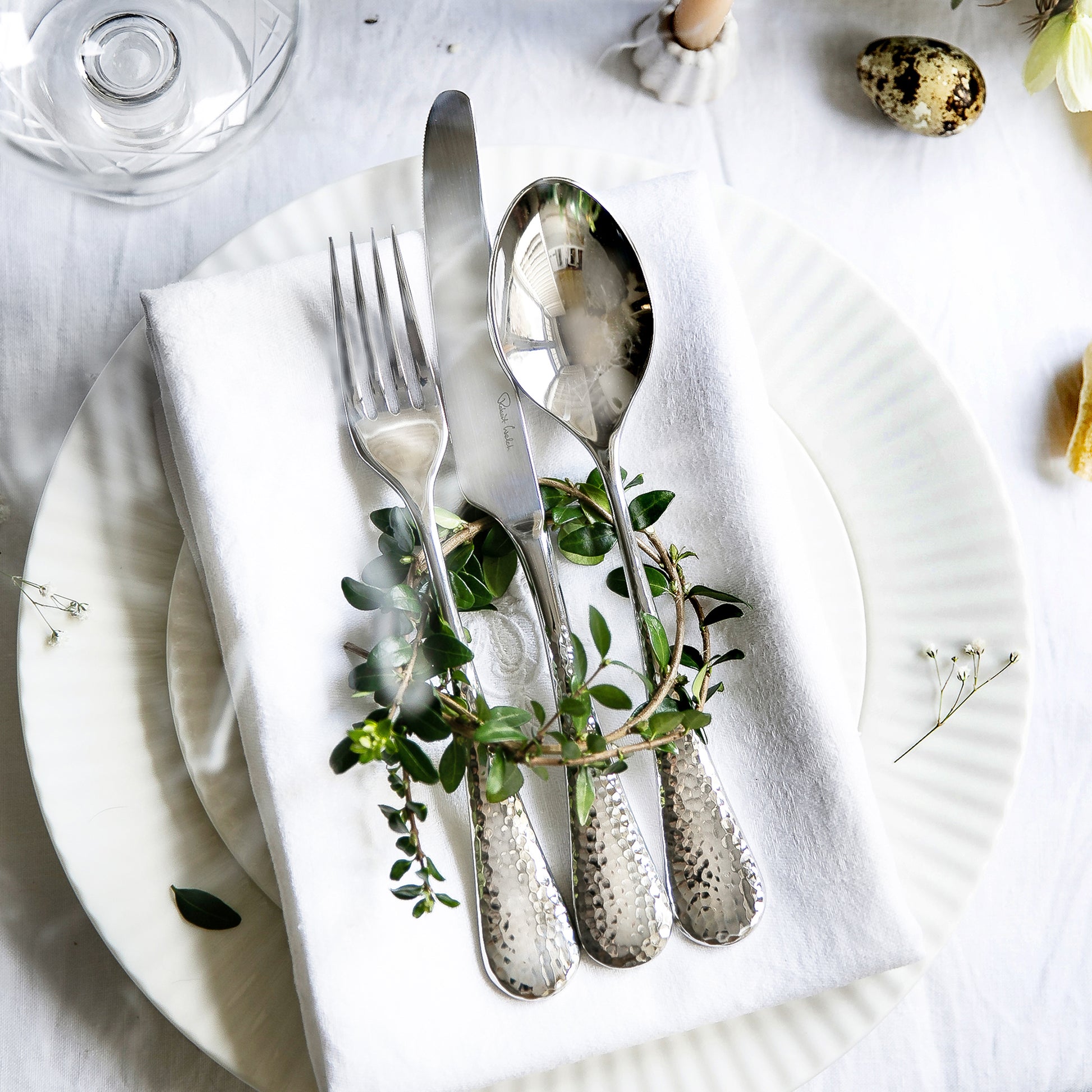 Honeybourne Bright cutlery is a sumptuous yet versatile design, inspired by the craft silversmithing technique of round hammer planishing that creates a light reflecting statement on the table. Made from the finest 18/10 stainless steel with a mirror-polished finish.