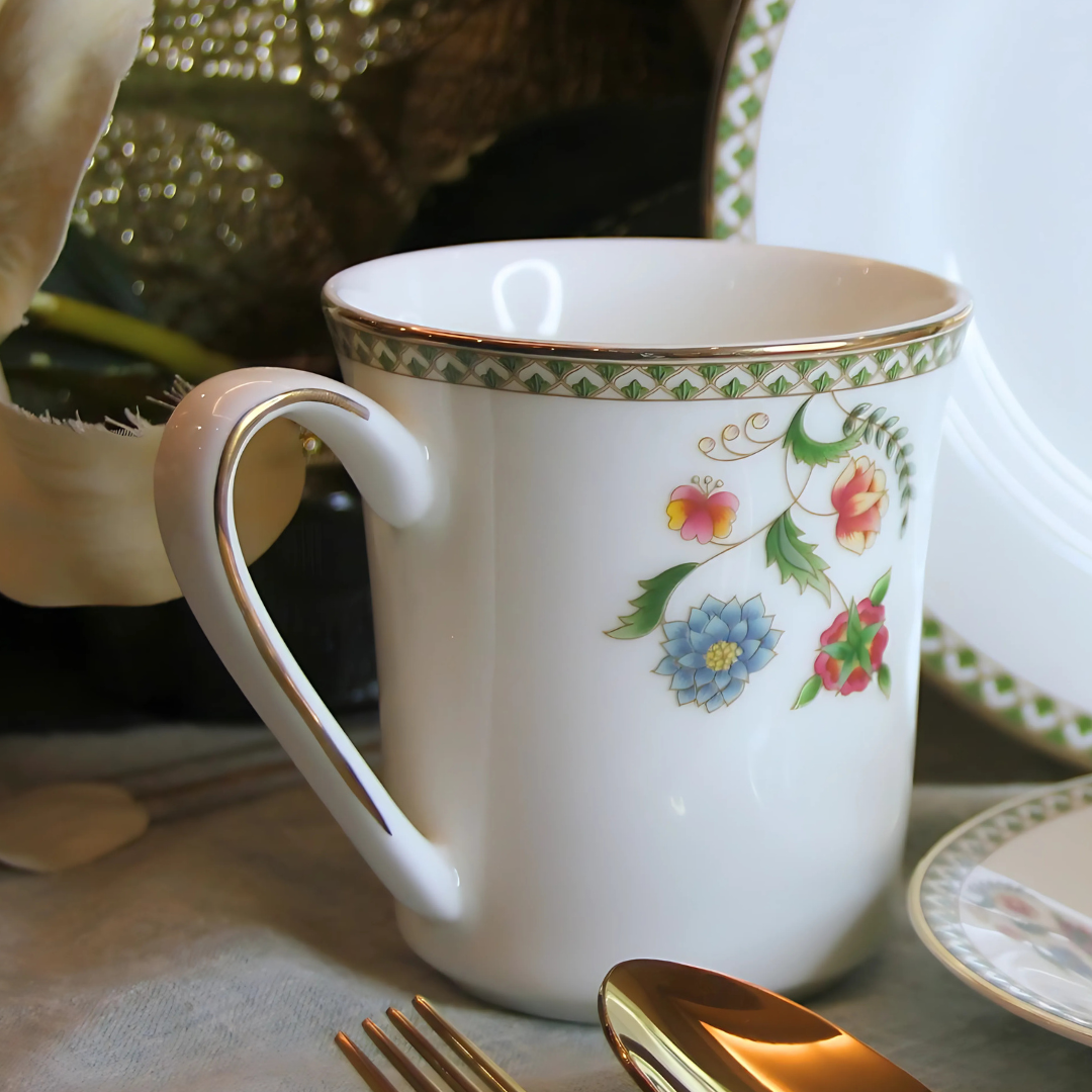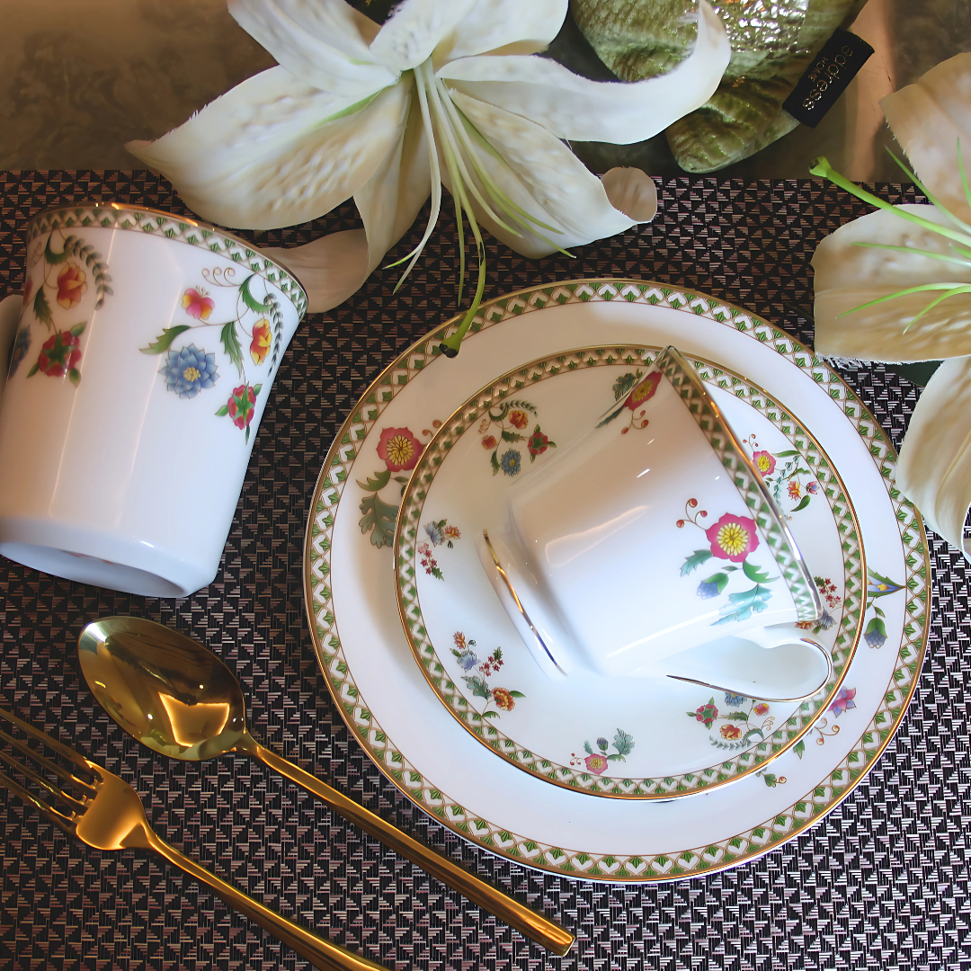 This design draws inspiration from the natural world, showcasing delicate floral and leaf patterns in soothing green tones. Influenced by the freshness of nature and the charm of hand-drawn sketches from vintage journals, it embodies timeless elegance. With its clean, minimalist aesthetic, this collection is ideal for those who value understated beauty in their everyday dining.