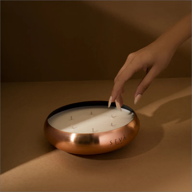 This beautifully handcrafted candle in a metal container is our take on a modern urli. Immerse yourself in the aromatic embrace of premium fragrances, as it infuses the air with a sense of tranquility and serenity.