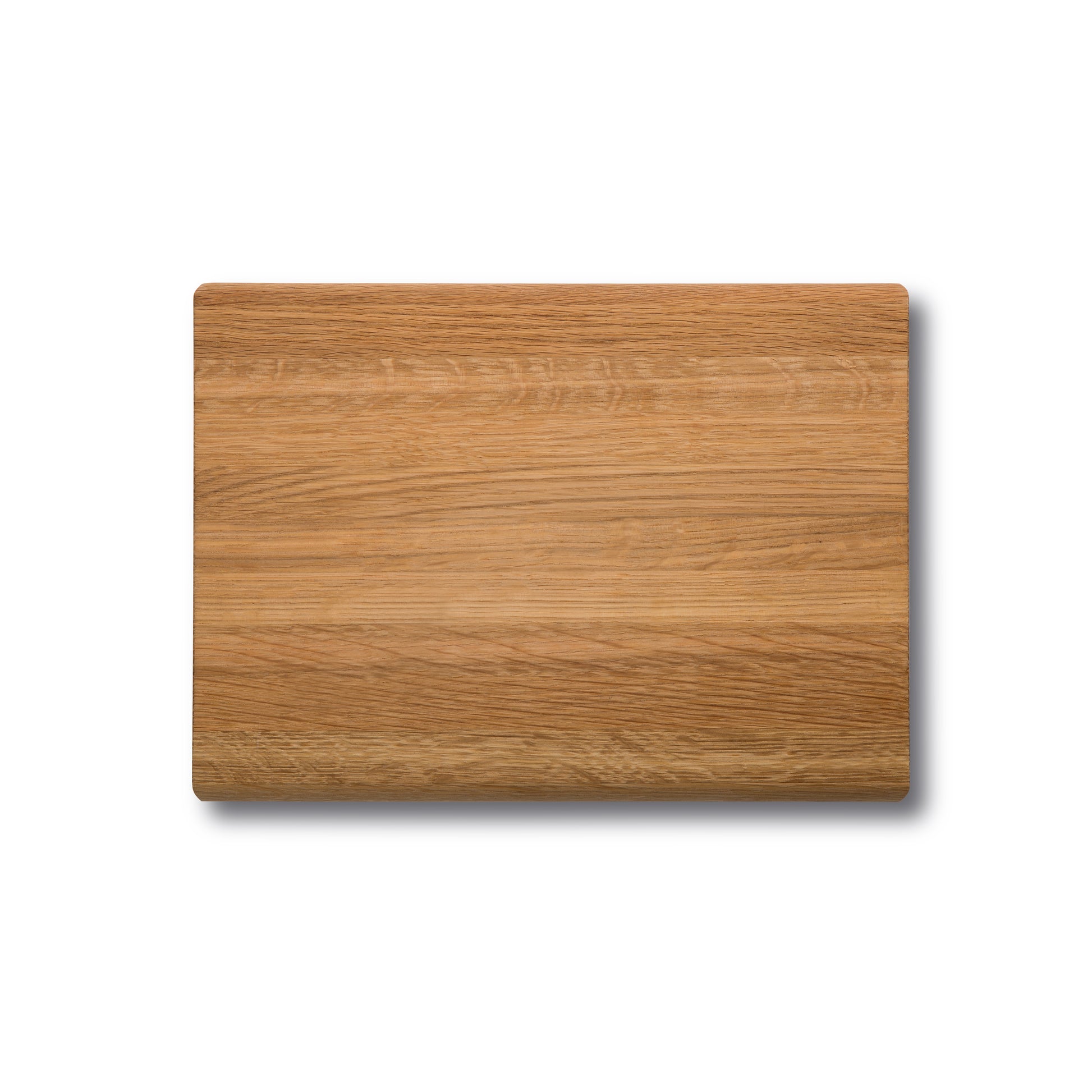 A rectangular wooden chopping board made from solid oak with a food-safe oiled finish. The natural wood material protects knife blades when preparing food.