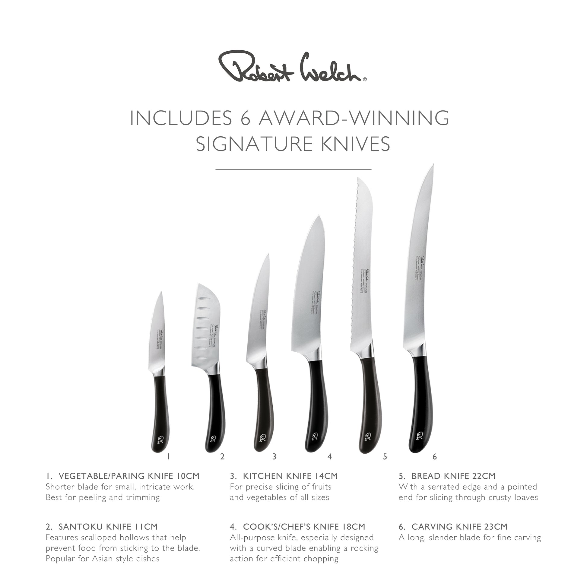 Book Oak Knife Block (1), Signature Carving Knife, 23cm (1), Signature Bread Knife, 22cm (1), Signature Santoku Knife, 11cm (1), Signature Cook’s Knife, 18cm (1), Signature Kitchen Knife, 14cm (1), Signature Paring Knife, 10cm (1)